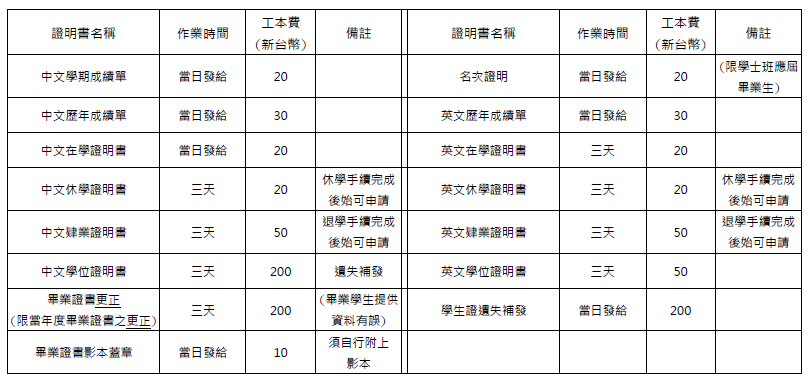 三、申請各項證明文件收費標準及作業時間如下: